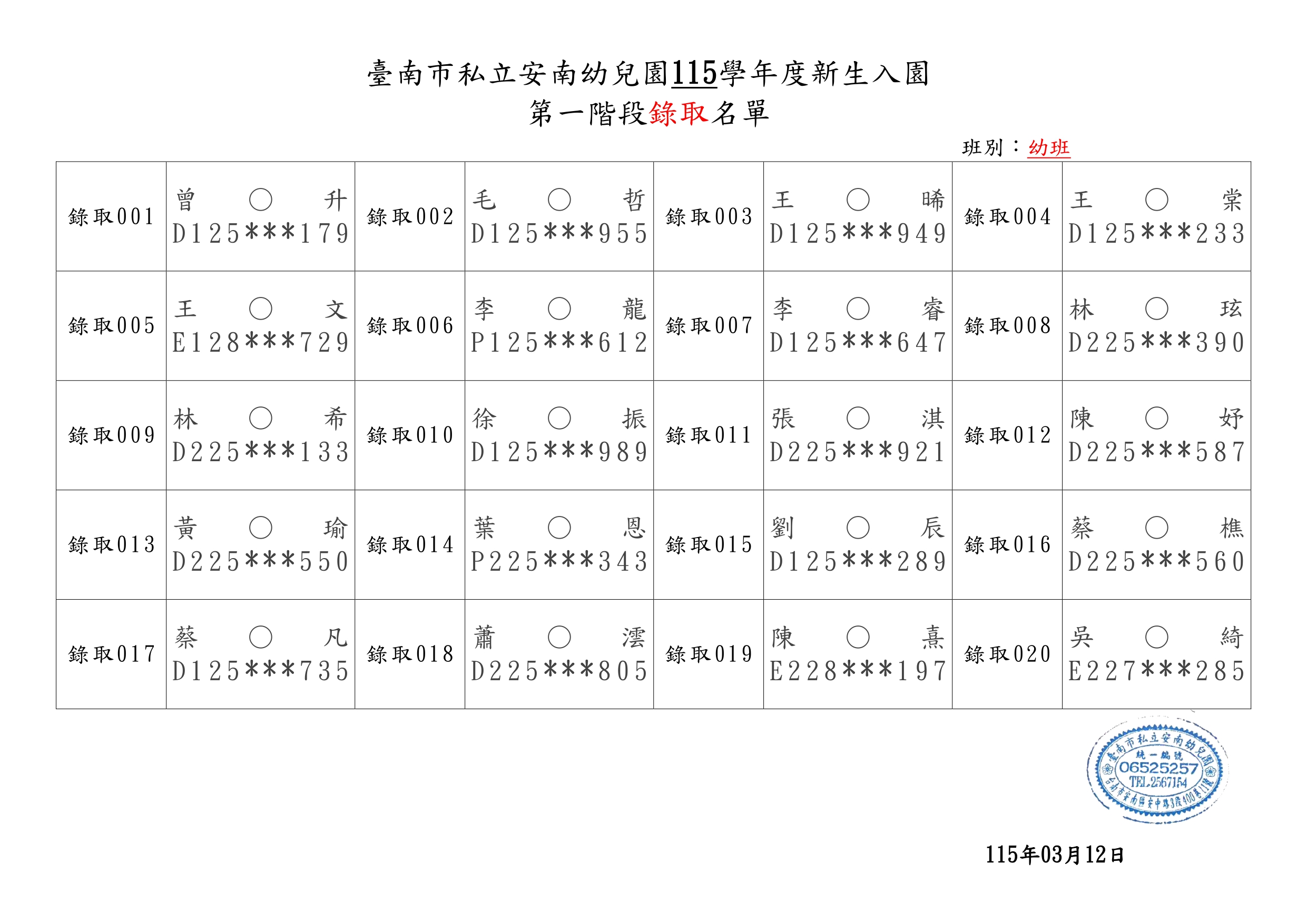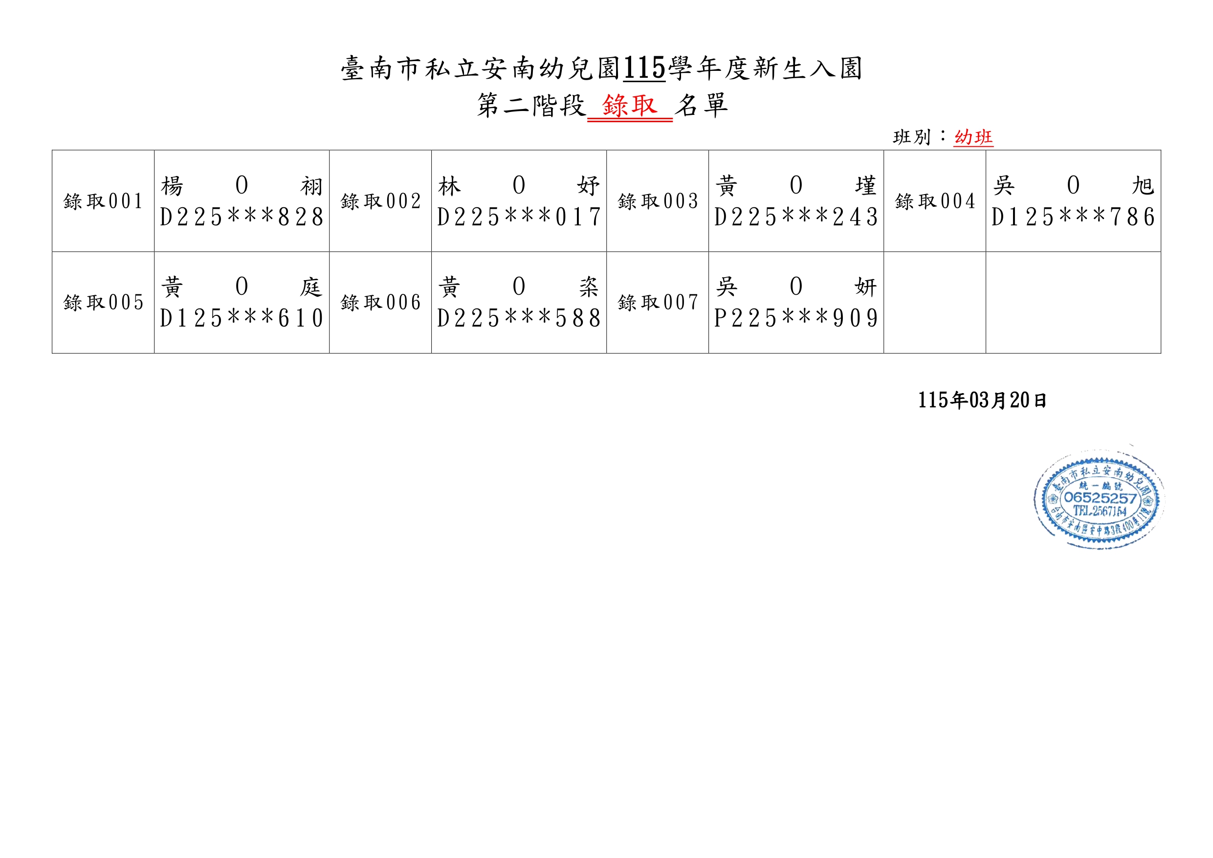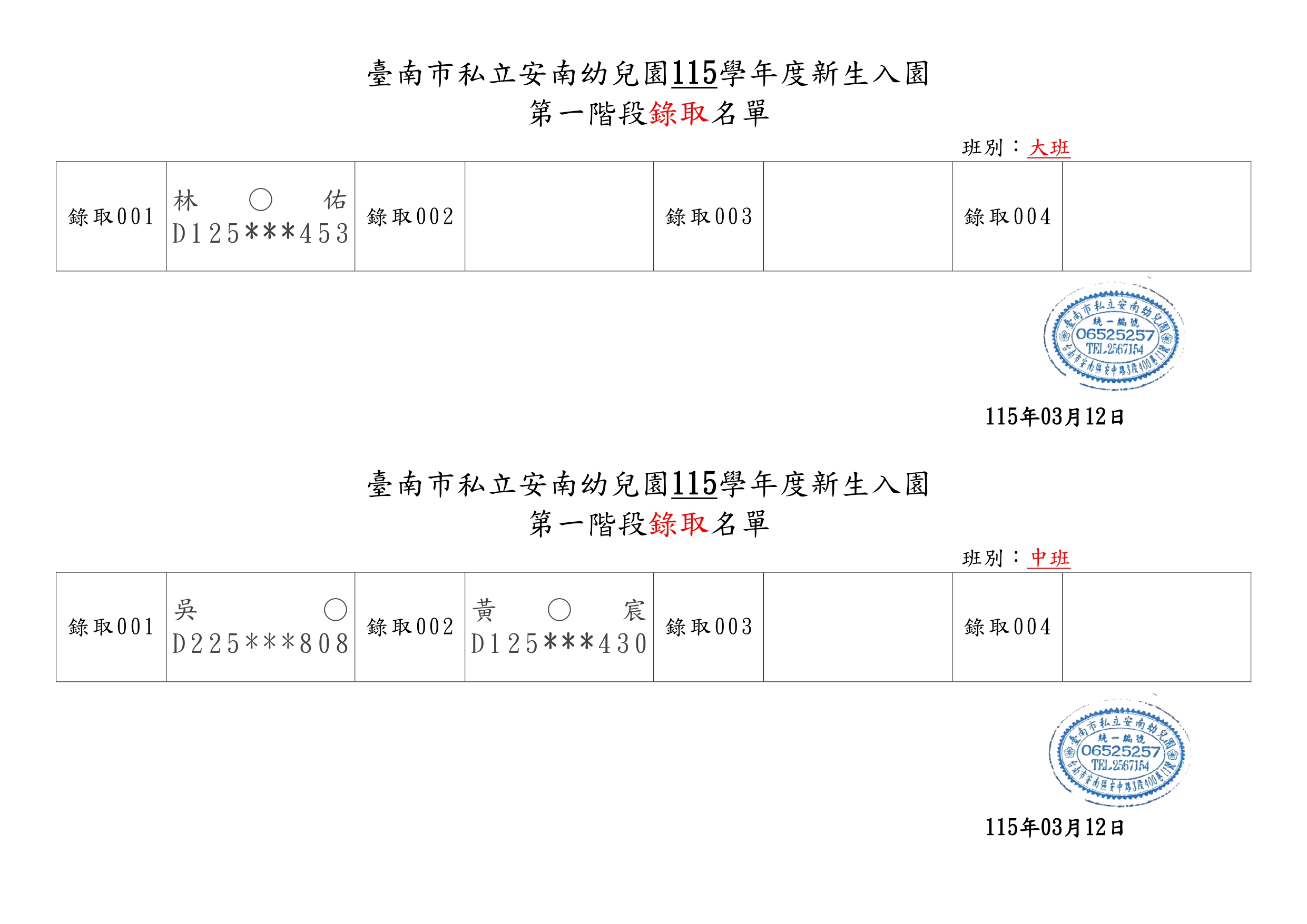 臺南市私立安南幼兒園115學年度第一階段新生錄取名單
