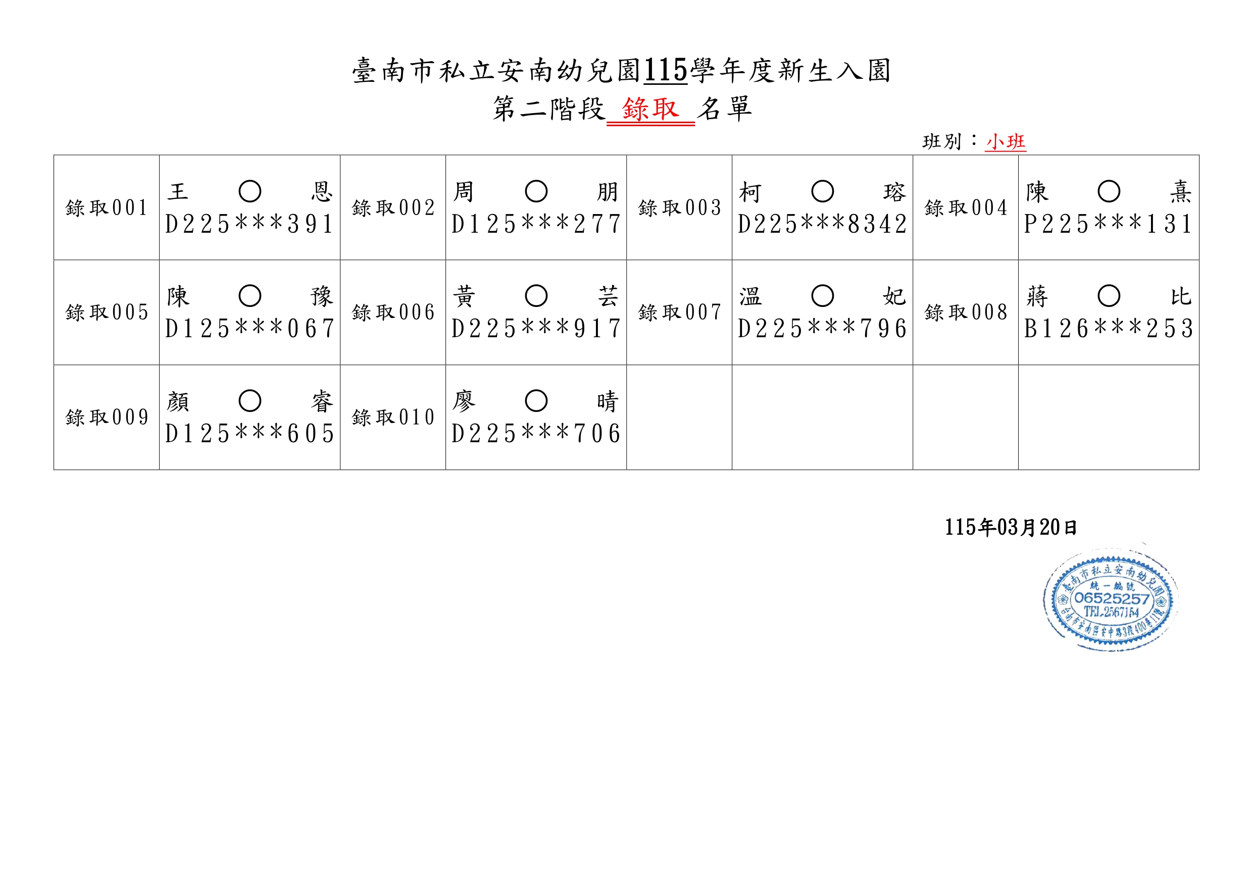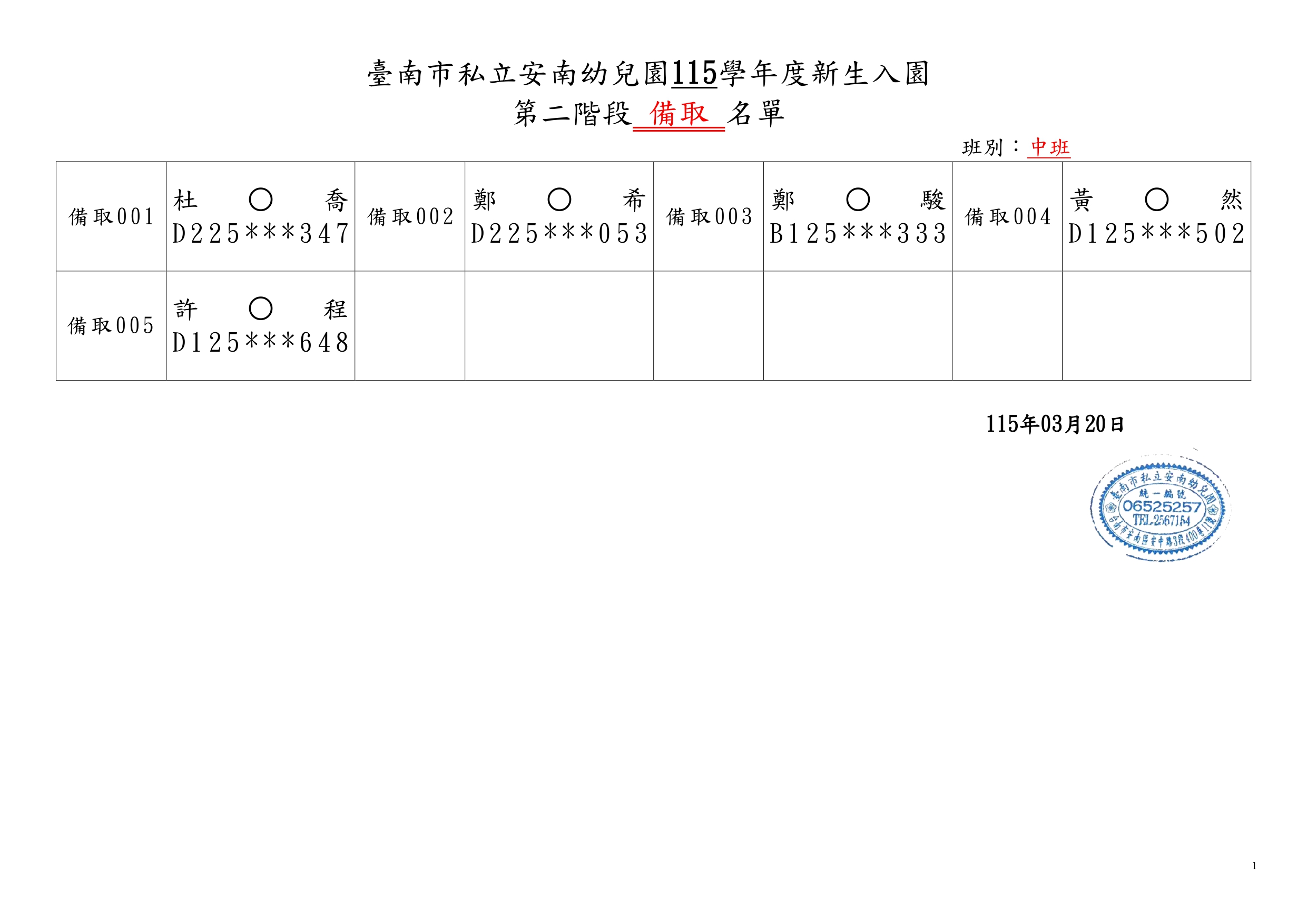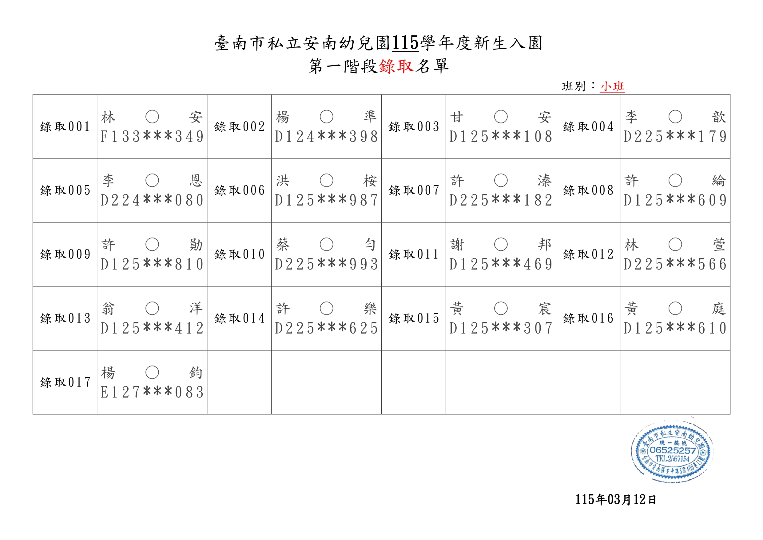 臺南市私立安南幼兒園115學年度第一階段新生錄取名單