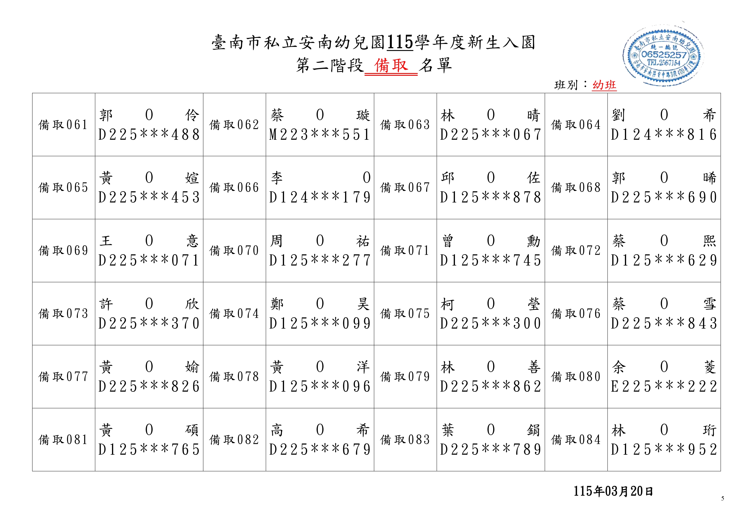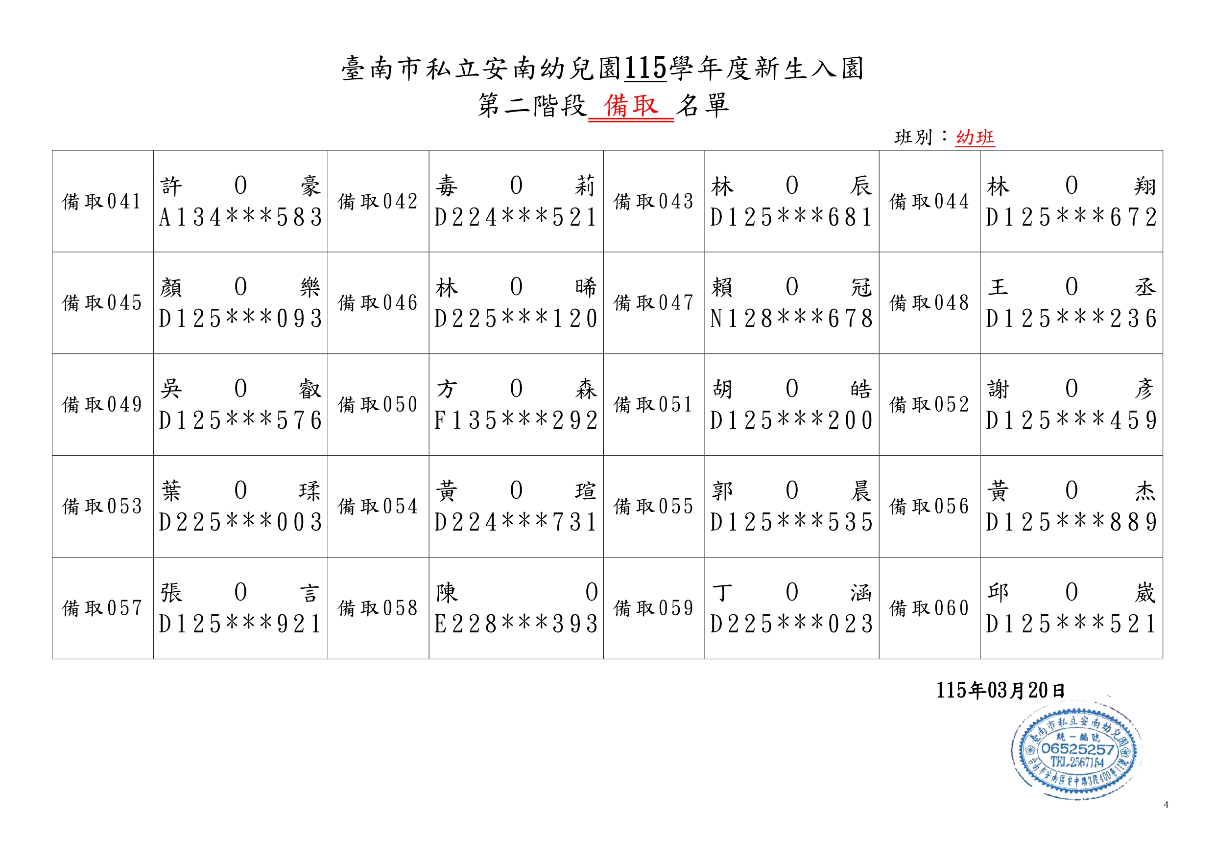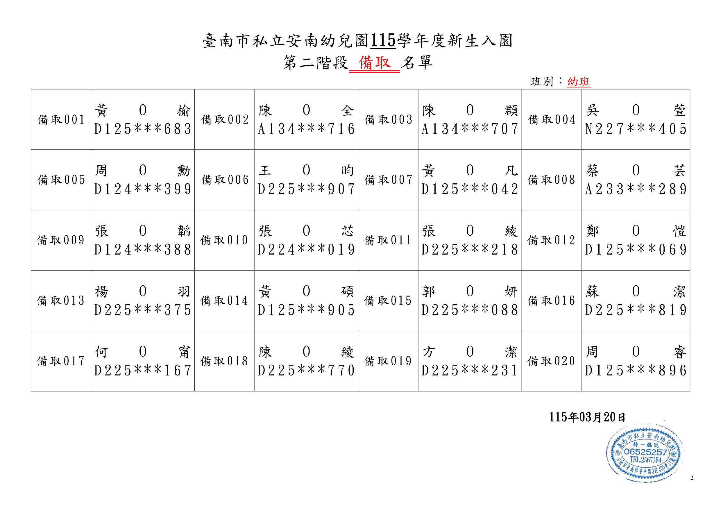 臺南市私立安南幼兒園115學年度第二階段新生錄取名單與備取名單